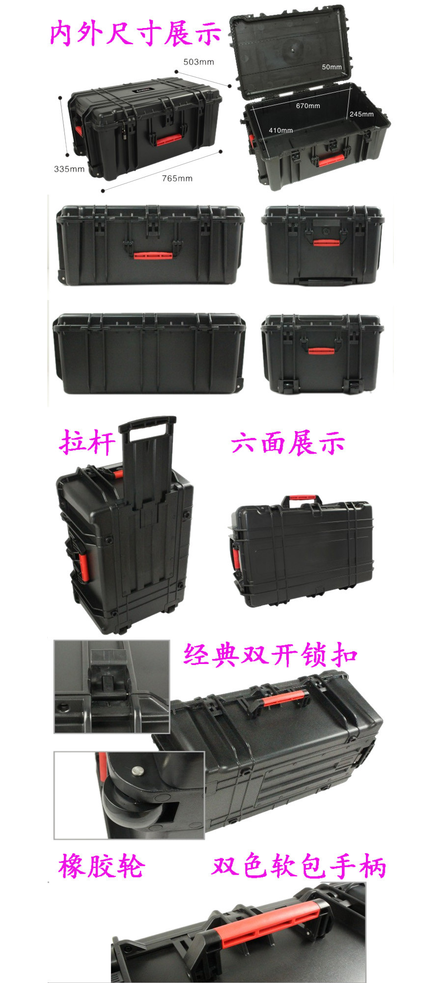 簡要說明:廣泛用于傳媒、公安、消防、軍隊、航空、戶外攝影、野外考察、科學探測等眾多領域的高端儀器、儀表。具有高強度、高抗壓沖擊、防潮、絕對密封、防塵、防水等特點。產品材質:ABS原料,箱體采用高抗沖擊的高分子聚合材料一體注塑成型,密封采用扁型彈性發(fā)泡密封橡膠條,確保防水氣密,所有較軸均采用不銹鋼材質。